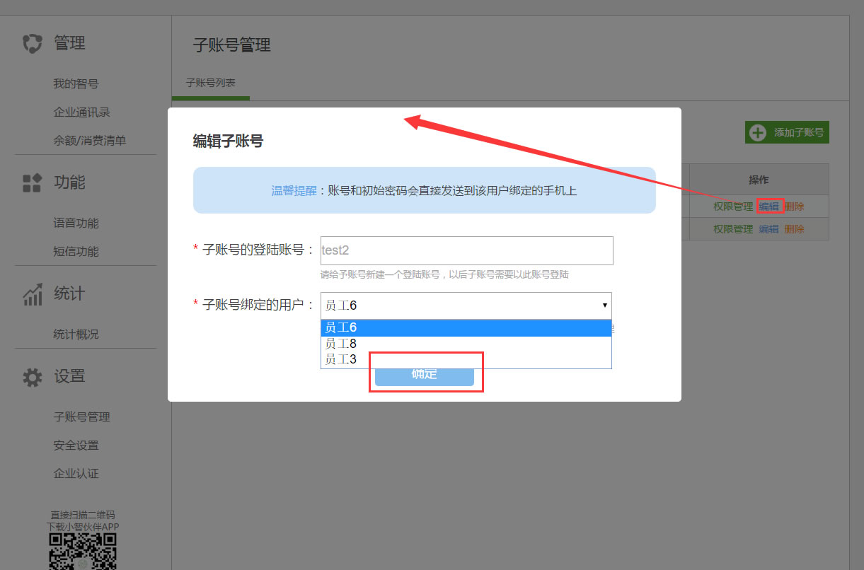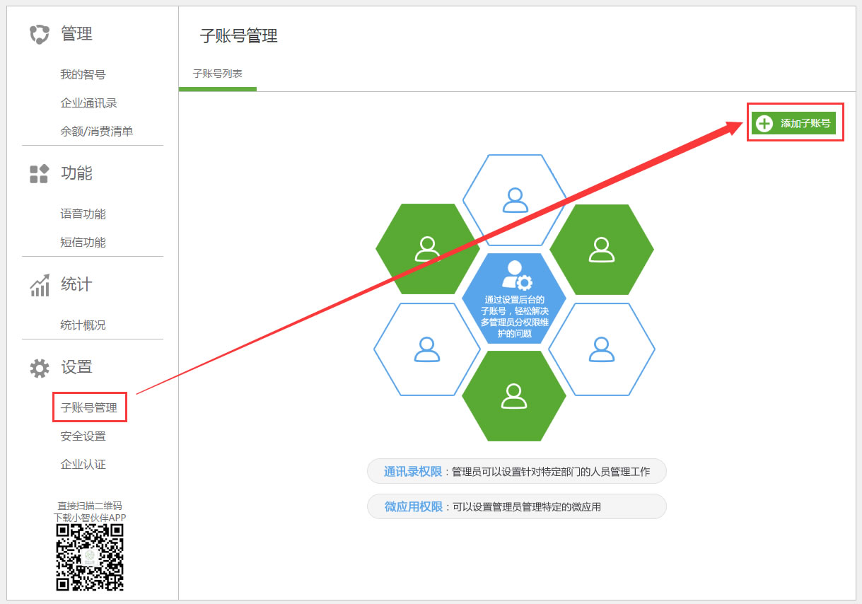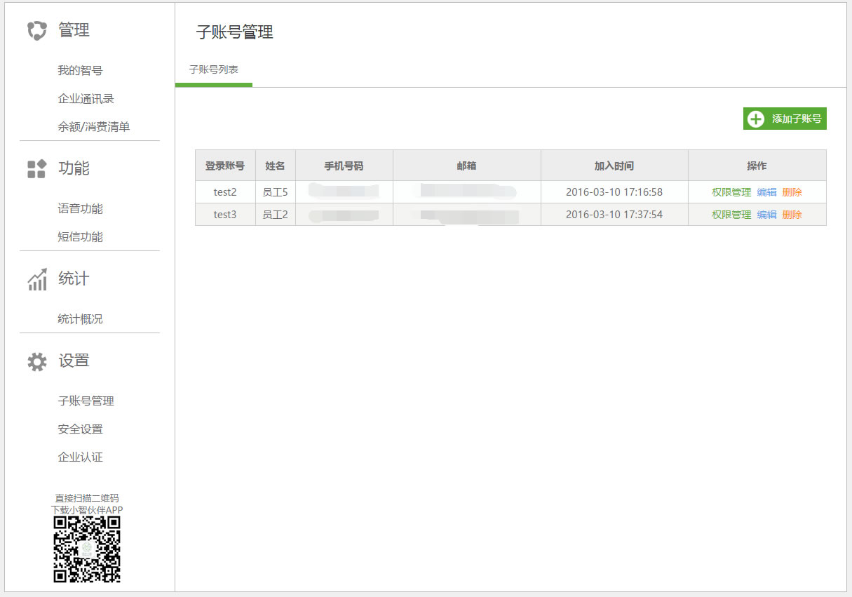 * 子账号默认拥有”安全设置“模块,可分配”我的智号“、”企业通讯录“、”消费清单“、”语音功能“、”短信功能“、”统计概况“模块,无法拥有”子账号管理“模块与”企业认证“模块。